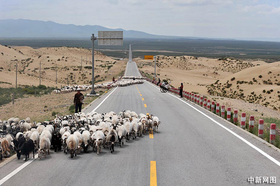 圖為公路上“過(guò)馬路”的羊群及牦牛。