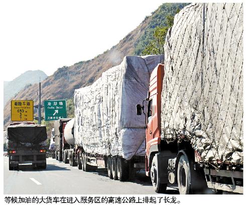 前天上午,巡邏民警從京港澳高速韶關段北上,只見乳源服務區入口、云巖服務區南行入口均有長達一公里左右的加油車龍。據了解,近日京珠北各服務區都出現大貨車排隊進服務區加油的現象,南下的大貨車在湖南境內每次只能加到200元的柴油,在京珠北境內服務一次加油最多也是400元,限量供應柴油造成了大貨車逢服務區必須進站加油。行駛的大型車缺油、車龍在路面排隊進服務區加油都給交通安全帶來壓力。