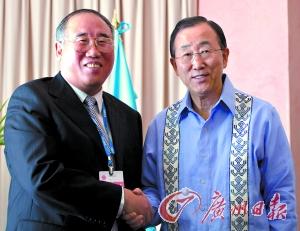 8日,正在坎昆出席聯合國氣候變化大會的國家發改委副主任、中國代表團團長解振華(左)與聯合國秘書長潘基文舉行會見。