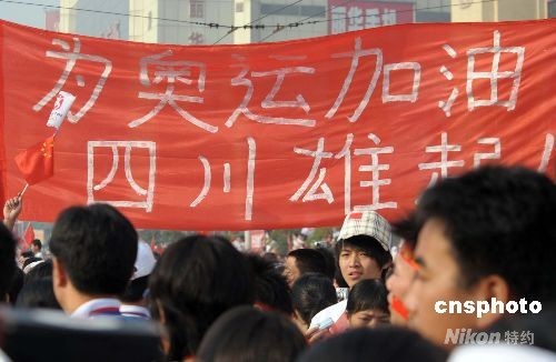5月16日,奧運圣火在江西南昌傳遞,在八一廣場舉行的起跑儀式上,民眾打起“為奧運加油 四川雄起”橫幅,為四川地震災民鼓勁加油。 中新社發 廖攀 攝
