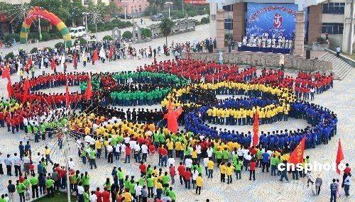 5月16日,地處偏僻山區的江西德興銅礦2008名礦山職工參加“全民健身與奧運同行”活動,以健步行、編五環等形式,傳遞奧運精神,支持北京奧運會,表達礦工喜迎奧運的心情。 中新社發 胡敦煌 攝