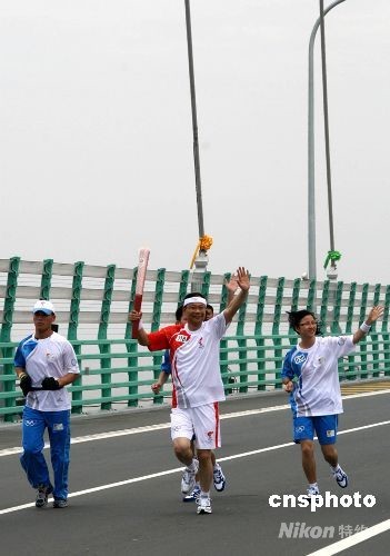 5月22日,奧運火炬?zhèn)鬟f寧波站最后一棒火炬手嚴(yán)宏軍,高舉火炬跑過杭州灣跨海大橋。這是全世界跨度最長的跨海大橋,嚴(yán)宏軍是這座大橋的建設(shè)者之一。 中新社發(fā) 周兆軍 攝