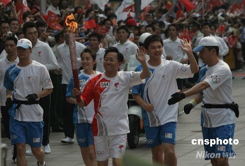 五月二十三日,中國乒乓名將姚振緒在上海繁華的南京路傳遞奧運火炬,受到上海市民歡迎。 中新社發 潘索菲 攝