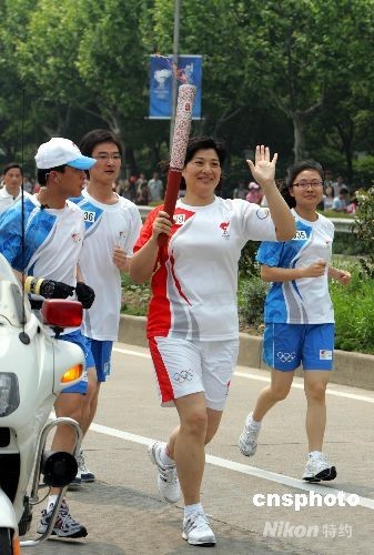 5月23日,北京奧運(yùn)圣火在上海開(kāi)始為期2天的傳遞,共有416名火炬手參加。圖為女排名宿李國(guó)君在滬傳遞奧運(yùn)圣火。 中新社發(fā) 湯彥俊 攝