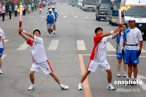 7月15日,奧運火炬在吉林松原傳遞。火炬手屈萬日(右)、張世民以優(yōu)美姿態(tài)交接火炬。中新社發(fā) 廖攀 攝