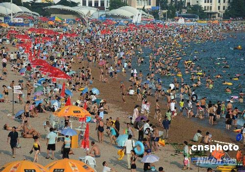 青島第一海水浴場游泳的游人爆滿。經(jīng)過一個多月的全力奮戰(zhàn),困擾2008北京奧運會帆船賽舉辦地青島的近海滸苔已得到了有效的清除和遏制,奧帆賽訓(xùn)練比賽場地和海水浴場又恢復(fù)了往日的熱鬧景象。中新社發(fā) 曲連遵 攝