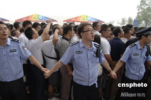 7月25日上午9時,第4階段奧運門票銷售正式開始,近百名奧運安保人員在北京五棵松籃球體育館外現場指揮數千球迷有序購票。中新社發 徐曦弋 攝