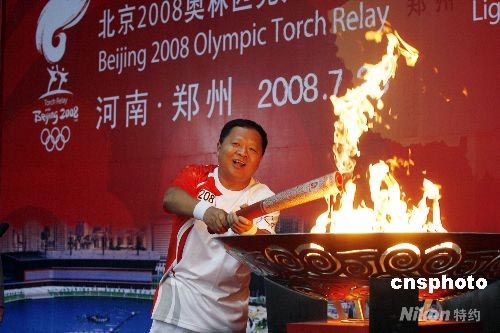 7月25日,中國工程院院士、中國信息與通信工程專家、解放軍信息工程大學(xué)校長(zhǎng)鄔江興點(diǎn)燃圣火盆,奧運(yùn)火炬在鄭州的傳遞正式結(jié)束。 中新社發(fā) 慎重 攝