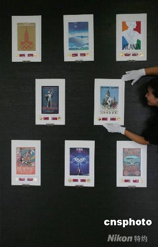 由國際奧組委授權、國際奧林匹克博物館館藏珍品《百年奧運——理解奧運會金牌海報典藏》大全套首批7月30日抵京,從即日起開始發售。該典藏首次集齊歷屆奧運會金牌,首次以絲綢印刷歷屆海報。圖為工作人員接收首批產品,并懸掛布置展出現場。 中新社發 李英 攝