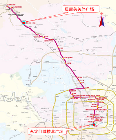 此次演練將由永定門城樓北廣場起點出發,經永定門北廣場、天橋南大街、天壇路、祈年大街、前門東大街、天安門廣場西側路、東長安街、南北河沿大街、平安大街、雍和宮大街、和平里西街、櫻花園西街、惠新西街、安苑路、安定路、北四環路北側主路、學院橋、北四環路北側輔路、保福寺橋、北四環路北側主路、海淀橋、頤和園路、芙蓉北路、萬泉河路、北五環路南側主路、八達嶺高速公路、小營出口、八達嶺高速公路東側輔路、昌平西關環島、八達嶺高速公路北側輔路、陳莊橋、南口東大街路口、八達嶺老路至岔道城口,沿八達嶺高速公路出京方向主路逆行至居庸關長城結束。