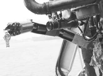 安裝在救生船后甲板的“水下機器人”通過專用吊車迅速潛入海中;遙控方艙內,士官廉法響、李明根據指令,嫻熟地操縱著遙控手柄,“水下機器人”在水中靈活機敏地游動搜尋開去。由于海底淤泥較深,加上“水下機器人”在海底的旋轉作業,很快把海水攪得渾濁不清。遙控人員迅即采用原地微調的辦法,操縱“水下機器人”繼續搜索。“水下機器人發現可疑目標!”短短幾分鐘后,遙控方艙內傳出了令人振奮的消息。彩色顯示屏前,記者看到,“水下機器人”伸出“機械手”,非常靈活地完成了伸、開、抓、夾等各種動作,牢牢地將可疑物———一只易拉罐握在了“手”中。也許是覺得打撈易拉罐的難度還不夠,有人又把一只手表扔進了海中!八聶C器人”接到了出征命令,又一次潛入海底,利用自身攜帶的水下電視、圖像聲納,只用了不到15分鐘的時間就完成了探摸任務。