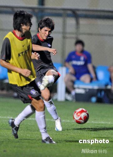 8月4日晚,韓國隊在秦皇島奧林匹克體育中心訓練場進行首次夜訓。在當晚的訓練中,韓國隊主要進行了隊員間的戰術、技術配合訓練。8月7日晚,韓國隊將在秦皇島奧林匹克體育中心體育場首戰喀麥隆。 中新社發 劉學忠 攝