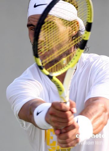 西班牙網球巨星納達爾在北京奧運網球賽場積極備戰。 中新社發 武仲林 攝