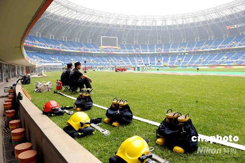圖為天津“水滴”體育場內加強安保工作。 中新社發 陳文 攝