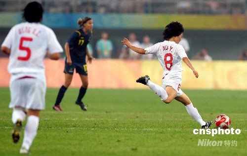 北京奧運會女足小組賽首輪比賽今晚全面打響,中國女足19時45分在天津奧林匹克球場迎戰瑞典隊。最終經過90分鐘鏖戰,中國女足憑借徐媛和韓端的進球,以2-1擊敗對手,迎來開門紅。中新社發 陳文 攝