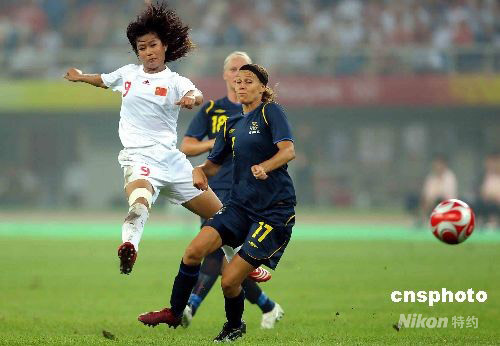 8月6日,北京奧運會女足小組賽首輪比賽全面打響,中國女足在天津奧林匹克球場迎戰瑞典隊。下半場第73分鐘,中國女足9號韓端大力施射破門,打入致勝一球。 中新社發 陳文 攝