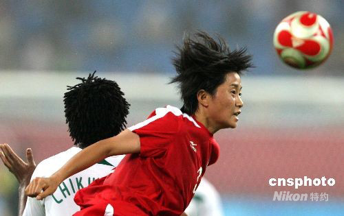 8月6日,北京奧運會沈陽足球分賽場女足預賽,朝鮮1:0戰勝尼日利亞隊。圖為朝鮮隊OM Jong Ran頭球爭頂。 中新社發 張宇 攝