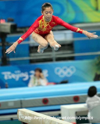 8月7日,中國女子體操隊在國家體育館進行賽臺訓練。 新華社記者林慧攝