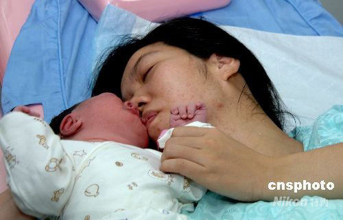 8月8日清晨5點30分,福州市民范敬琴在福建省第二人民醫(yī)院婦產(chǎn)科手術(shù)室順利產(chǎn)下一名奧運男寶寶。圖為范敬琴親吻喜降人間的奧運寶寶。中新社發(fā) 劉可耕 攝