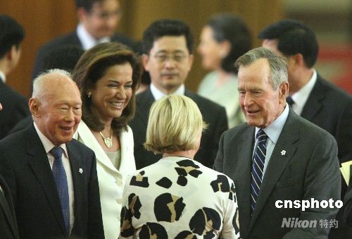 8月8日,中國國家主席胡錦濤在北京人民大會堂宴會廳為出席北京奧運會的貴賓舉行歡迎宴會。圖為新加坡內閣資政李光耀、美國前總統老布什出席北京奧運歡迎宴會。中新社發 廖文靜 攝