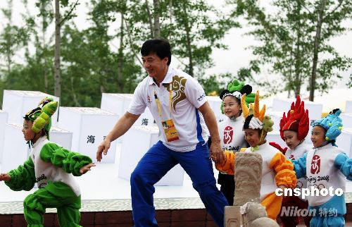 8月9日,大型文化展示活動《中國故事》在北京奧林匹克公園公共區正式開幕,在開幕式上,成龍攜帶“福娃”上場。奧林匹克公園公共區中國故事展示區的30多個祥云小屋,將展示各個省區市留存的國家級非物質文化遺產。 中新社發 王東明 攝