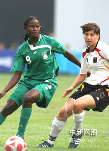 8月9日,奧運德國女足對陣尼日利亞隊。圖為兩隊在激烈爭搶。中新社記者 張宇 攝