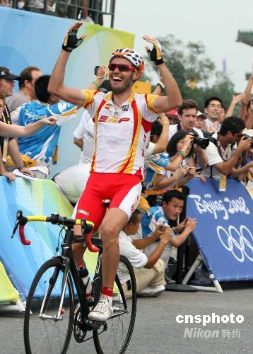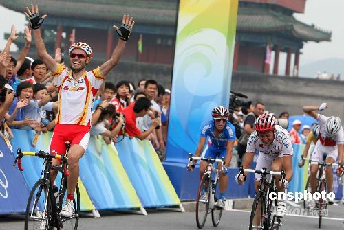 8月9日,2008北京奧運會自行車男子公路賽落幕,西班牙選手薩·桑切斯以6小時23分49秒奪得冠軍。中新社發 武仲林 攝
