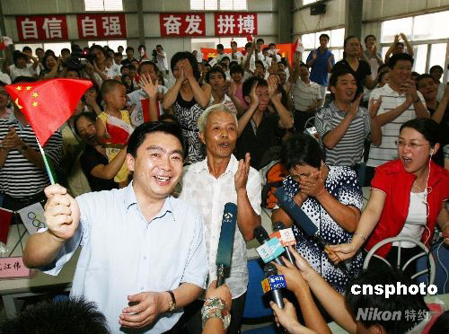 在8月11日下午舉行的北京奧運會女子舉重58公斤級比賽中,蘇州姑娘陳艷青不負眾望,力奪冠軍,讓在蘇州觀看比賽的父母激動萬分。 中新社發 徐志強 攝