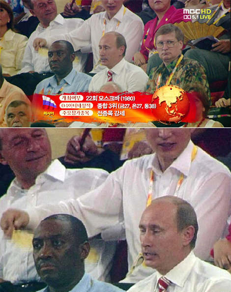 據韓國《朝鮮日報》報道,這一視頻被上傳到美國YouTube網站,是對8日北京奧運會開幕式現場直播的畫面進行編輯的。當俄羅斯代表團入場時,鏡頭對準了坐在俄羅斯貴賓席上的俄羅斯總理普京,就在這時,坐在普京身后的李明博也被拍個正著。