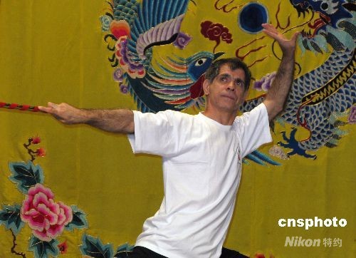 英國四十七歲的男子格法(圖)十二日在北京湖廣會館大戲樓秀了一出猴戲。 這名學京劇已經十五年的英國人,生在英格蘭、長在不列顛、安居在美國,卻對中國京劇著了迷。格法的主要角色是演猴子。圖為格法給北京奧運會期間的中外非注冊記者表演他演了多年的猴戲。中新社發 徐長安 攝