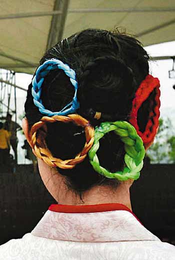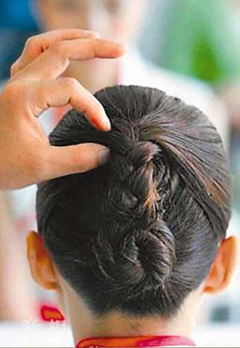 這款比較突出大的包發,突出飽滿的熱情。此外,發型的線條動感十足,和旗袍的風格也比較一致。另外,發型師特別搭配了奧運五環的小配飾,使發型脫離了單調的感覺,又體現了奧運元素。這個小飾品別在頭的側面,頒獎時觀眾很容易看到。