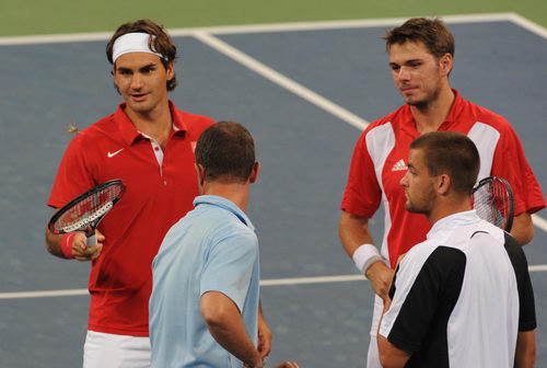 奧運賽場花許多,在網球男雙第二輪比賽前,一只螞蚱飛到了裁判的后背上,“天王”費德勒用球拍趕走了螞蚱。新華社記者邢廣利攝