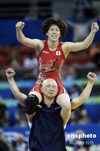 8月16日,北京奧運會摔跤女子自由式55公斤級的決賽在北京中國農業大學體育館進行,日本選手吉田沙保里戰勝中國選手許莉獲得冠軍。圖為吉田沙保里與教練在賽后“疊羅漢”慶祝奪冠。中新社發 盛佳鵬 攝
