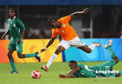 8月16日晚,北京奧運會男子足球1/4決賽,尼日利亞(綠)對陣科特迪瓦比賽在秦皇島奧體中心舉行,最終尼日利亞2:0勝科特迪瓦,挺進四強。中新社發 劉新 攝