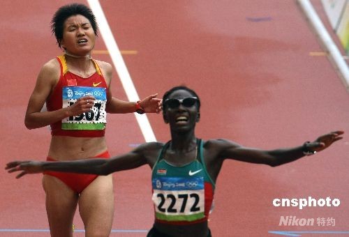 8月17日,在北京奧運(yùn)女子馬拉松決賽中,中國選手周春秀以二小時(shí)二十七分零七秒的成績奪得銅牌。中新社發(fā) 任晨鳴 攝