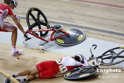 8月18日,場(chǎng)地自行車(chē)女子記分賽決賽在北京老山自行車(chē)館進(jìn)行,14號(hào)日本選手和田見(jiàn)里美在比賽中與其他選手相撞受傷。 中新社發(fā) 盛佳鵬 攝