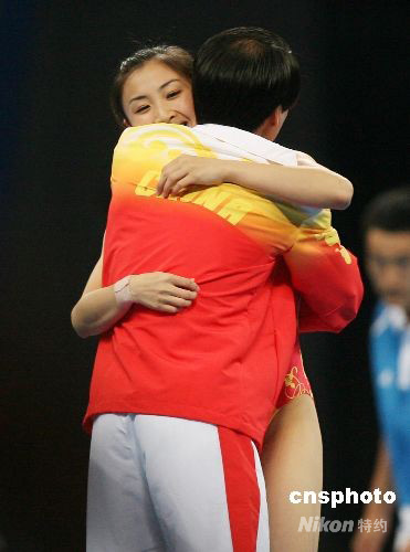 圖為何雯娜奪冠后與教練擁抱。中新社發 武仲林 攝
