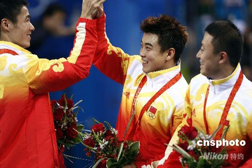 8月18日,中國隊奪得北京奧運會男子乒乓球團體金牌,主教練劉國梁、隊員馬琳、王皓淚灑賽場。中新社發 盛佳鵬 攝
