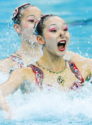 18日下午,北京奧運會花樣游泳比賽在“水立方”迎來第一個比賽日。第一輪雙人技術自選動作的比賽結束后,俄羅斯隊的奧運會和世錦賽雙料冠軍達維多娃/葉爾馬科娃憑借絕對的優勢,以49.334分排在第一位,中國選手蔣文文/蔣婷婷以48.084分排在第四位。