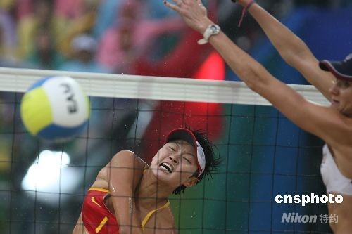 8月21日,中國選手田佳、王潔在奧運沙灘排球決賽中以0 :2負于美國選手克麗·沃爾什、米絲蒂·梅—特雷納,獲得亞軍。中新社發 武仲林 攝
