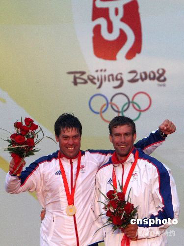 8月21日,北京奧運會帆船男子龍骨艇—星級獎牌輪比賽在青島舉行,英國選手伊恩·珀西/安德魯·辛普森獲得冠軍。 中新社發 趙振清 攝
