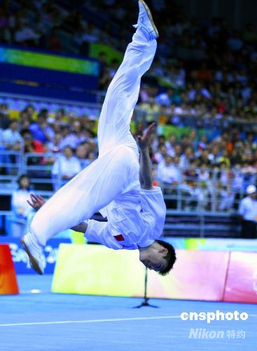 8月22日上午,中國運動員袁曉超在北京2008武術比賽男子長拳賽中奪得金牌,俄羅斯、伊朗選手分別獲得銀牌和銅牌。中新社發 宋吉河 攝
