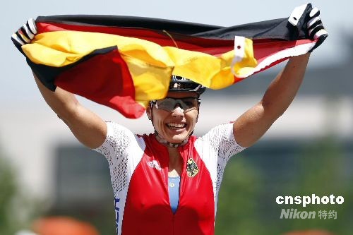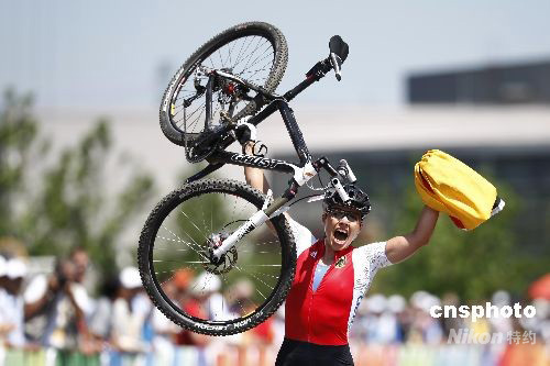 8月23日,北京奧運會自行車山地分項女子越野賽在北京老山山地自行車場舉行。德國選手扎比內·施皮茨一路保持領先,最終以1小時45分11秒的成績順利摘金。中新社發 盛佳鵬 攝