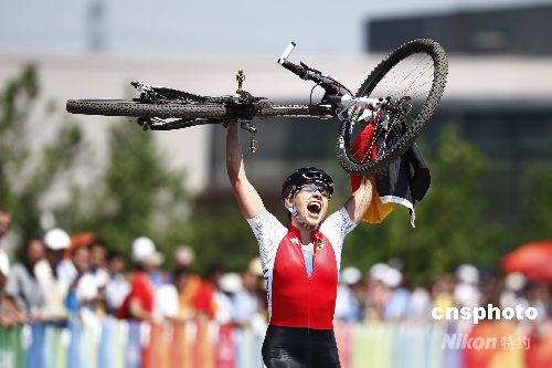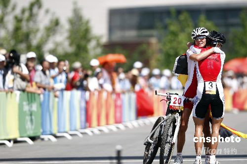 圖為冠亞軍在終點(diǎn)相擁慶祝。中新社發(fā) 盛佳鵬 攝