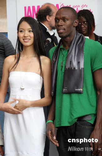 世界小姐張梓林向新科"飛人"博爾特贈送圍巾