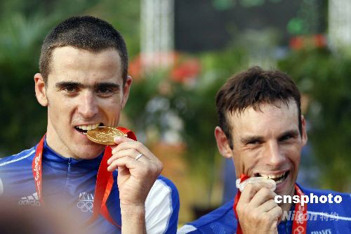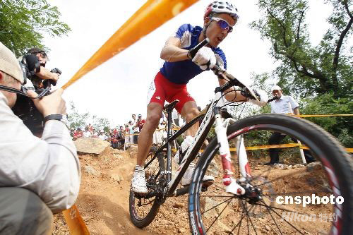 8月23日,在北京老山山地自行車(chē)場(chǎng)進(jìn)行的男子自行車(chē)越野賽中,法國(guó)名將朱利安-阿布薩隆(左)以1小時(shí)55分59秒成功衛(wèi)冕該項(xiàng)目的冠軍。法國(guó)另一位選手讓-克里斯托夫-佩羅(右)以1小時(shí)57分06秒的成績(jī)獲得銀牌。 中新社發(fā) 盛佳鵬 攝