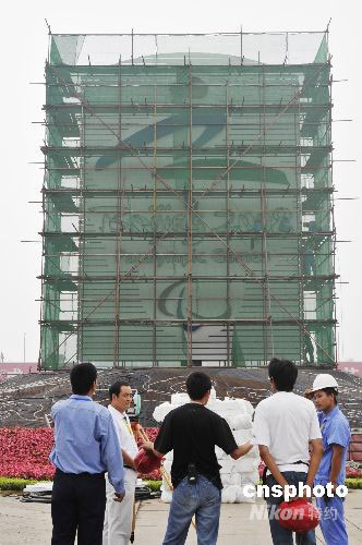 8月29日上午,北京天安門廣場,正在安裝的殘奧會會徽“天地人”。據(jù)悉,離殘奧會會徽“天地人”揭幕還剩下最后測量階段。中新社發(fā) 王宇婷 攝
