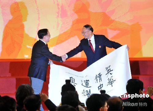 八月二十九日晚,香港特區政府在會展中心舉行酒會歡迎北京奧運會內地金牌運動員代表團訪港。圖為特首曾蔭權向國家體育總局局長、代表團團長劉鵬致送一幅國學大師饒宗頤書寫的“奧運精英 光耀中華”字畫。中新社發 鄧慶樂 攝