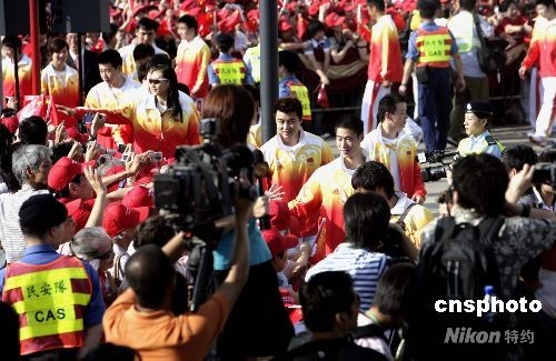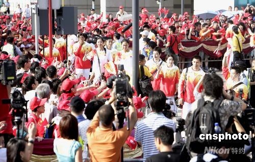八月三十日上午八時,北京奧運會內地金牌運動員代表團到香港金紫荊廣場觀看升旗禮,圖為運動員與大批香港市民見面。中新社發 張勤 攝