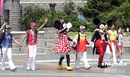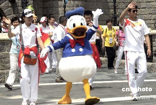 八月三十一日,正在香港訪問的奧運金牌運動員,分別到迪士尼樂園及海洋公園參觀游覽。圖為奧運金牌選手向熱情的香港市民揮手致意。中新社發 張勤 攝